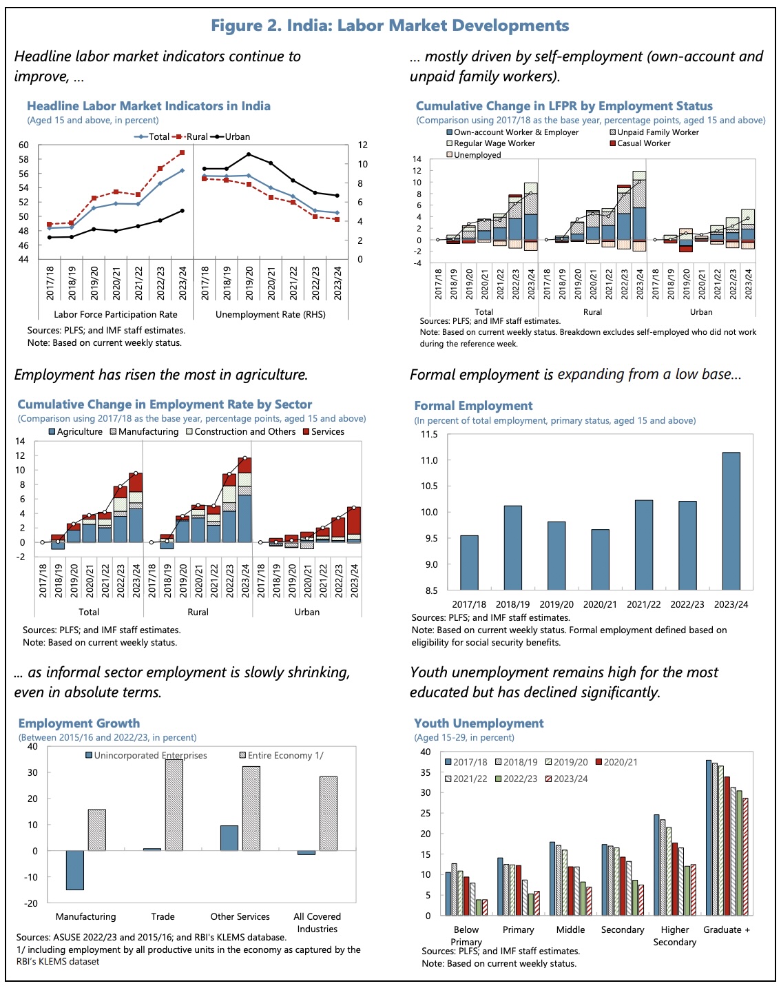 The IMF note that, whilst the labour force participation rate has been increasing (from 48.4% in 2017/18 to 56.4% in 2023/24), much of the increase has been driven by own-account and unpaid family workers and that, since the pandemic, there has been an increase in agricultural employment, which fits ill with traditional development paths.