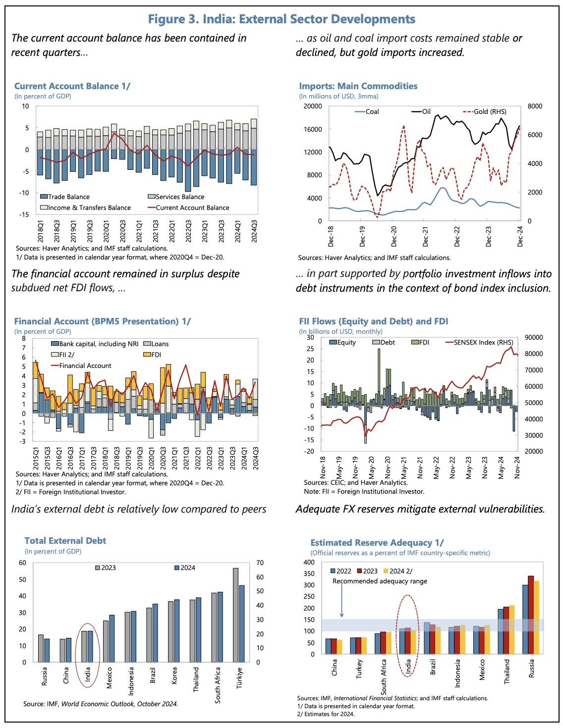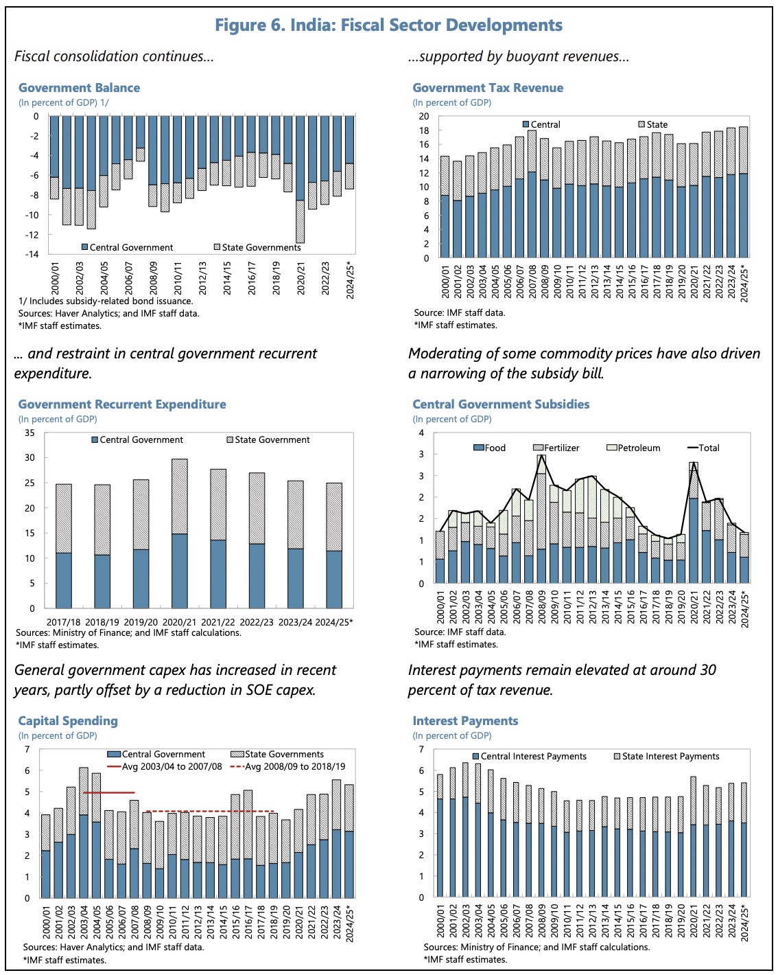 The fiscal balance has also been moving in the right direction, the general government balance declining from 9% GDP in 2022/23 to 8.1% GDP in 2023/24. Within this, revenue and capital spending have increased, whilst central government current expenditure has been restrained and subsidies have declined with lower commodity prices. In 2024/25, the general government deficit is expected to fall further to around 7.4% GDP, supported by high central bank dividends and buoyant personal income tax revenue. Grants-in-aid from the central government to the states have declined. A slow start to their capital spending in the current year suggests the states’ deficit may sustain at around 3% GDP.