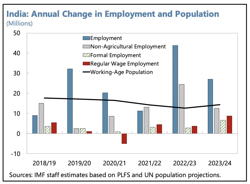 Labour market: The IMF believes job creation would be supported by the implementation of new labour market codes designed to enhance market flexibility and ease the constraints keeping firms inefficiently small. Suggestions include relaxing the hiring and firing regulations, more flexible and targeted social safety nets designed to facilitate the migration of workers from rural to urban areas and between states, and measures to encourage female employment.