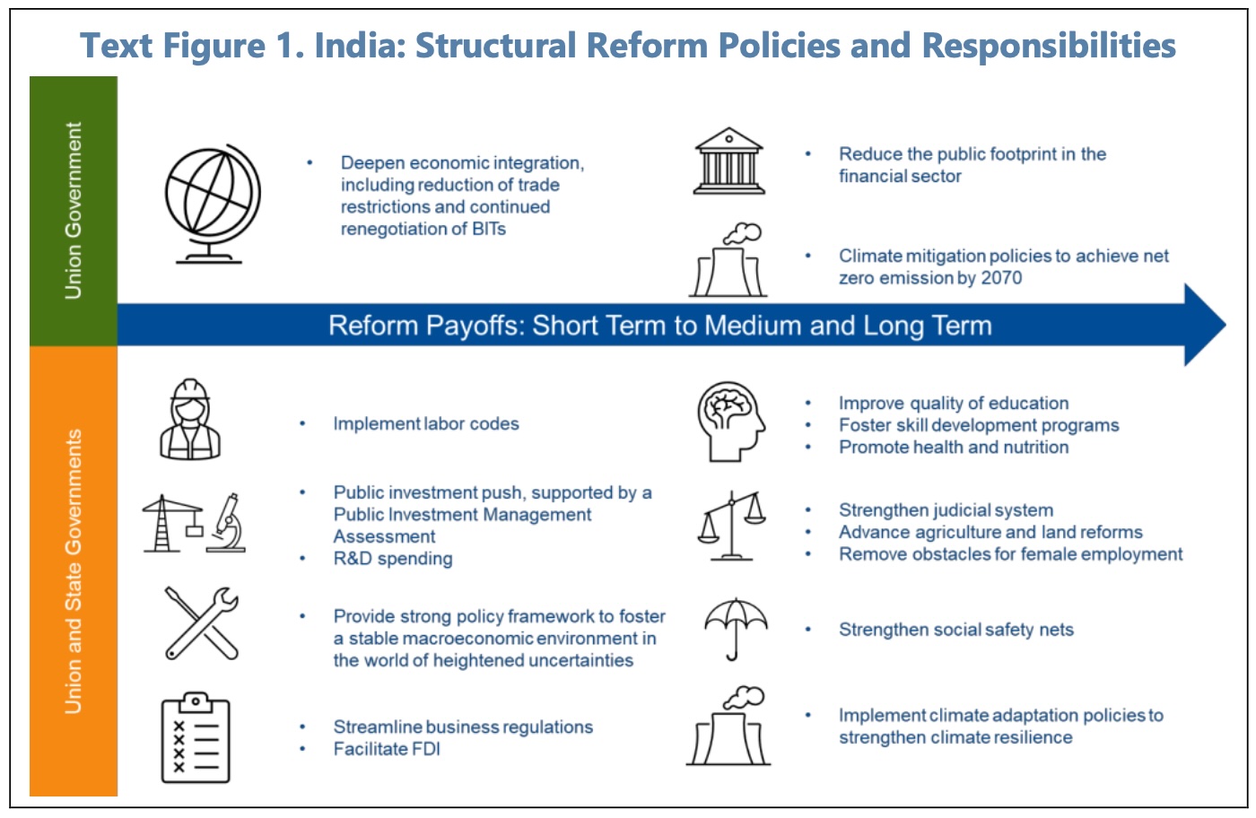 Reducing external trade restrictions and fostering bilateral, regional, and multilateral trade will strengthen India’s integration into global value chains, thereby attracting FDI, promoting technological transfer and boosting productivity. Whilst the IMF acknowledge that negotiations are underway with the UK and EU, they suggest India should consider participating in the Regional Comprehensive Economic Partnership (RCEP) between ASEAN and China, Japan, Korea, Australia and New Zealand.