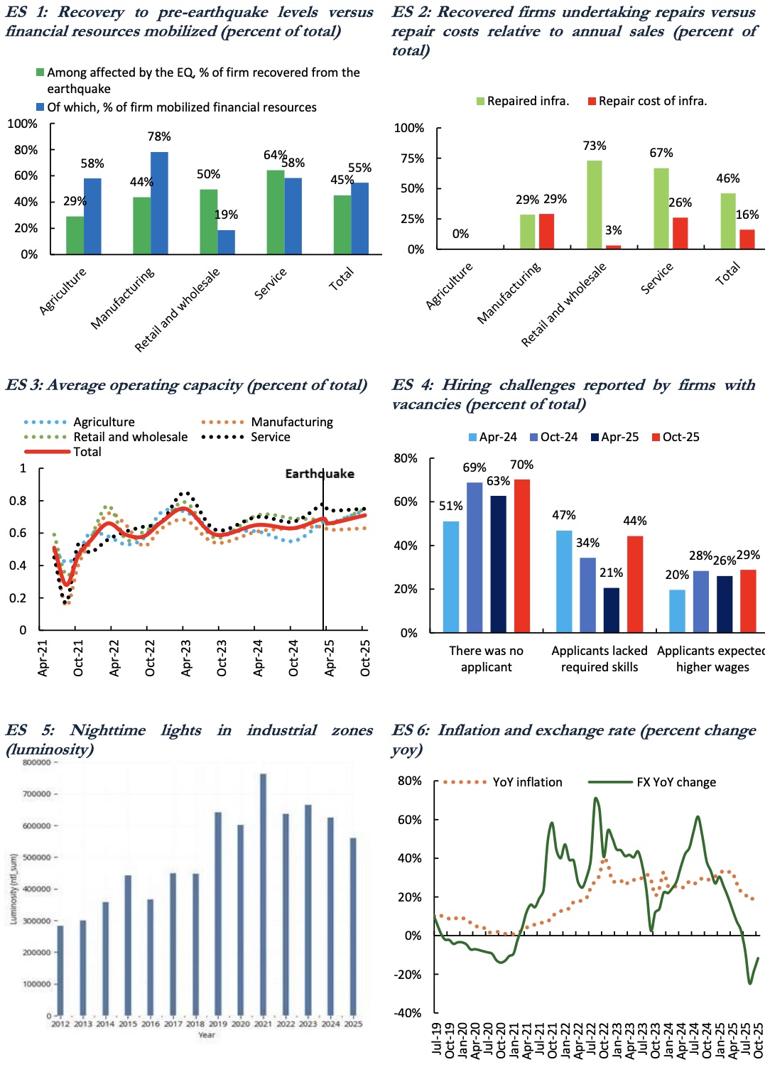 In business, power shortages present a critical bottleneck, with night-time light data from industrial zones indicating a broad-based decline in real activity. The labour market has experienced further deterioration, with the earthquake, conflict and conscription all contributing to outward migration and mismatches between the demand for skills and supply. Average firm operating capacity has risen, but only to 71%, a level well below pre-earthquake levels. Agricultural output has shown some resilience, manufacturing less so. In aggregate, the economy is expected to be 13% smaller than it was before the pandemic.