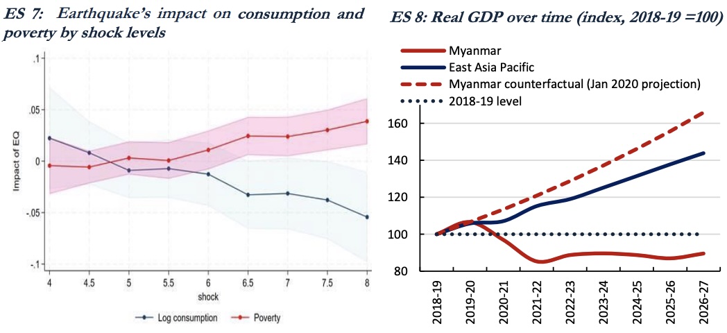 Only 45% of the firms they have surveyed are enjoying pre-earthquake levels of activity, with capital-intensive firms suffering more than most. Household vulnerability and poverty have worsened, especially in areas most affected by the earthquake (Mandalay, Sagaing, Naypyitaw), whilst 3.6 million people have now been displaced by conflict.